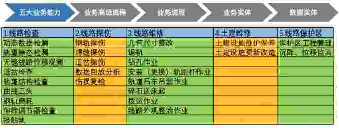 在轨道运维业务中,,,,,我们形成了完整的从业务能力(业务域)-业务流程-业务实体-数据模型的分析梳理过程。。。。。。。。轨道运维业务能力如下图所示::::::::