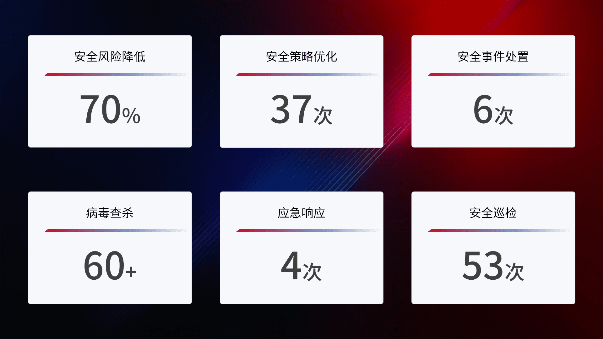 提供全面的安全事件报告体系,,,,包括处置报告、、、周报、、季度和年度总结,,,,结合持续监控,,,,帮助客户深入了解网络安全状况。。