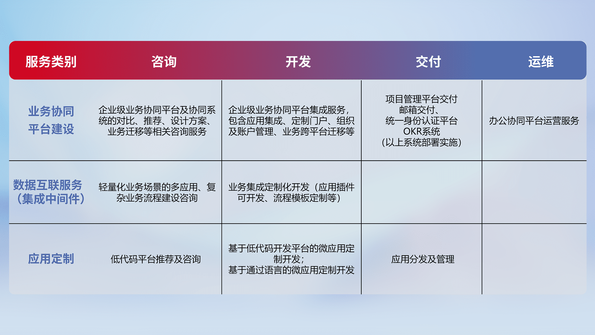 针对钉钉、、、企微、、、、IDaas等平台级产品提供产品的规划、、方案、、、、交付、、、、定制化开发等服务,,实现如统一协同办公、、、智能客户服务、、混合会议管理、、智能数据查询、、、等业务场景,,,实现数字化转型。。